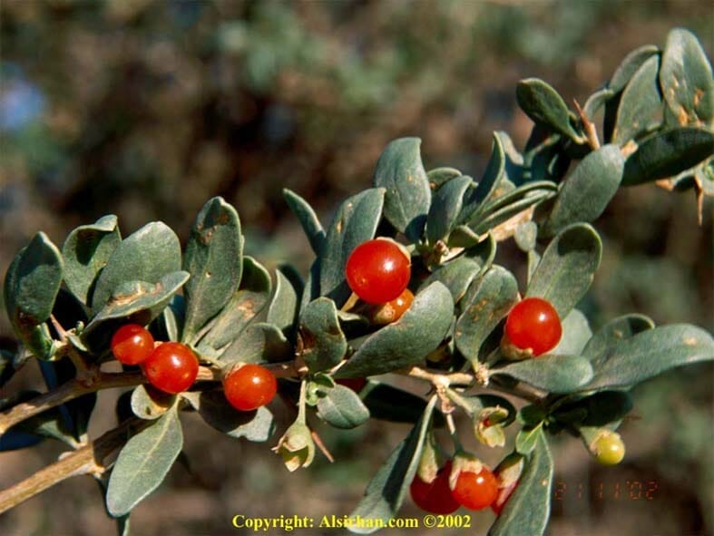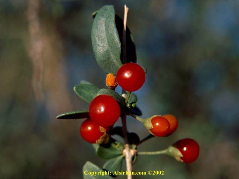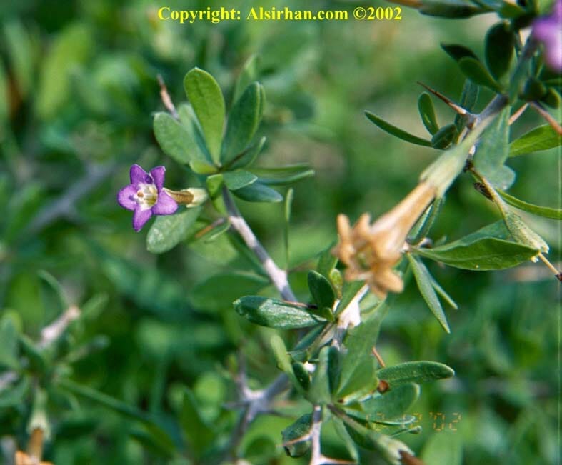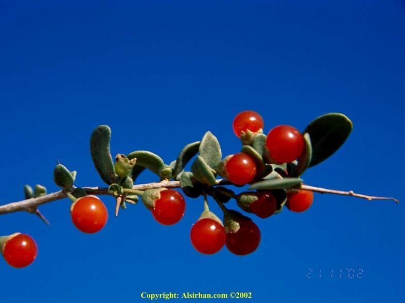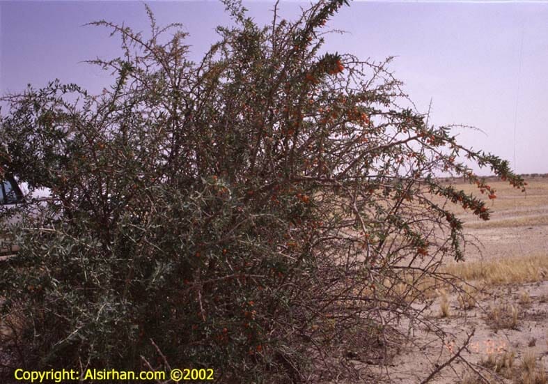 العوسج شجرة شوكية معمرة من العائلة الباذنجانية (Solanaceae ) تبنت في الأرض الرملية والصخرية يصل ارتفاعها إلى المتر ونصف وهي مورقة في جميع الأوقات ويتجدد نموها مابين شهري مارس وأبريل، وزهرتها تكون بوقية الشكل بلون بنفسجي فاتح أو أبيض وبها خمس بتلات. وثمرتها كروية الشكل بلون برتقالي أو أحمر، وتكون أصغر قليلاً من حبة الحمص، وتؤكل ثمارها وهي حامضة تشبه طعم الطماطم. وهي من الشجيرات التي يتشائم منها البدو ويزعمون أن الجن يسكنها، والإبل إذا كانت معتلة تأتيها من مسافات بعيدة لتتغذى عليها. وفي الربيع تؤمها الطيور وتستخدمها الطيور الجارحة الصغيرة كالصرد بغرز فرائسها على شوكها. الصورة التالية تبين شجرة العوسج وبها الثمر وقد التقطت الصورة في شهر أبريل: